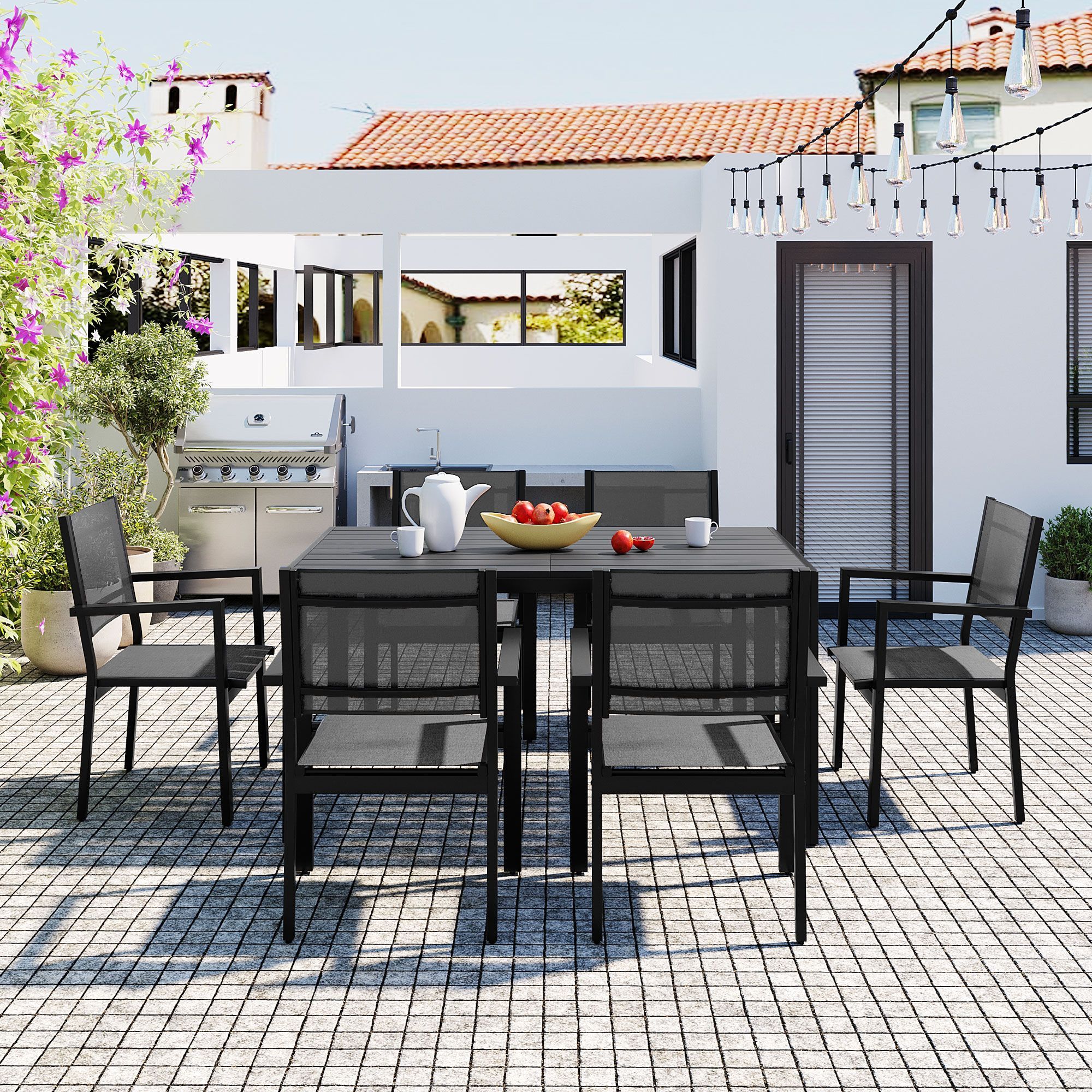 [Multi-scene application]: Perfect for various outdoor settings, such as gardens, balconies, or patios areas, this dining set seamlessly blends with different environments and enhances the overall atmosphere.